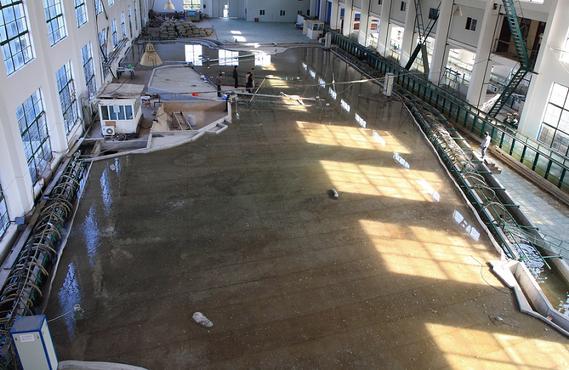 该系统由多个32通道开边界模型多泵控制柜、数百个小型潜水泵、水位和流速量测设备、工控计算机和测控软件等组成,51暗网 自行研制。潮流模型试验中计算机控制模型边界上布设的每一台的小型水泵(流量预先标定)的运行,能准确模拟开边界海域复杂潮流场的流速大小、流向、潮位变化过程,结合移动式不规则波造波机、泥沙测控系统等设备,可进行模拟波浪、潮流、泥沙共同作用的整体物理模型试验。