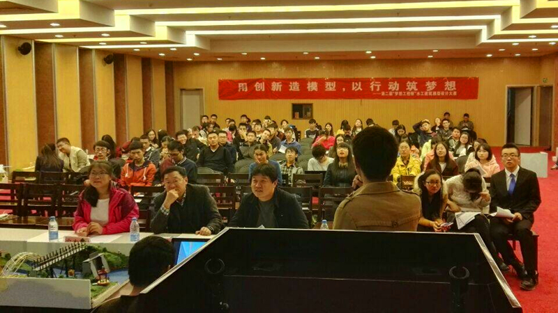 比赛开始前,参赛人员依次签到,随着各式各样奇巧创新的水工建筑模型被带入比赛场地,赛场变得火药味十足。两点,决赛正式开始。首先由主持人王聪宣布比赛细则,接着参赛选手依次上台展示并介绍自己组的作品。各组同学以专业知识为基础,详细剖析了作品的构思、原理、制作过程、心得感悟等方面。陈浩组的“巨无坝”水电站采用新奇的发电装置并结合物理公式精确计算发电效率,可靠的科学依据引来阵阵惊叹;赖颖组的作品精美细致,各类建筑一应俱全;戴睿组炸开喜马拉雅山的想法更是别具一格,让人印象深刻。这是一场知识的对决,这是一场思维的碰撞。最后,马志国老师和安杰晶老师对本次比赛进行了精彩的点评并鼓励大家平时多开发创新的思维,大赛在雷鸣般的掌声中落下帷幕。