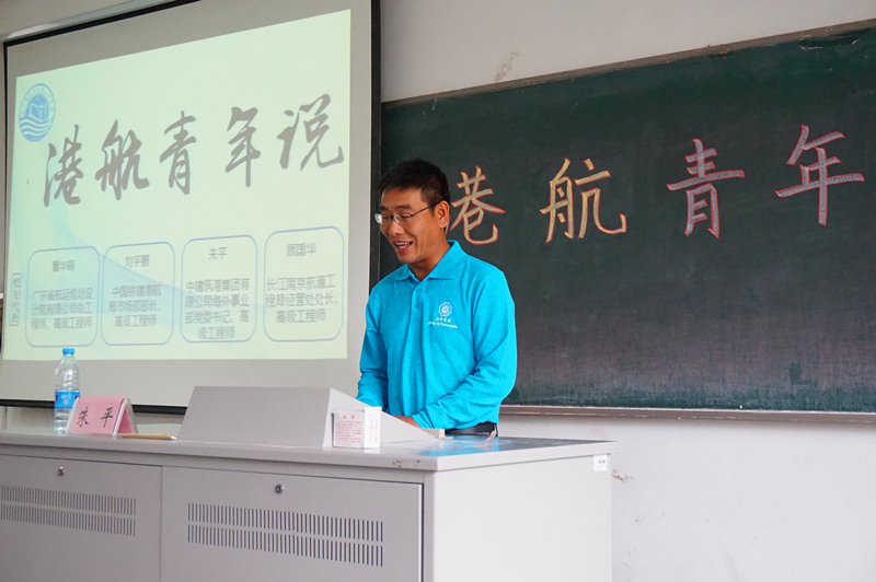 2016年10月15日上午10:30,港航院96届校友,广东省航运规划设计院有限公司总工程师、高级工程师董华钢,中国铁建港航局市场部部长、高级工程师刘宇鹏,中建筑港集团有限公司海外事业部党委书记、高级工程师朱平,长江南京航道工程局经营处处长、高级工程师顾国华返回母校,与百余名本科生相聚一堂,回忆大学生活,分享人生经验。
