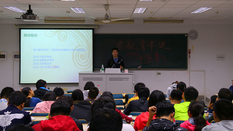 首先,徐圣卓同学对自己的奥运会志愿者申请过程进行了简单介绍:2014年参与青奥会志愿者工作后开始着手申报奥运会志愿者,申报工作首先是填写一系列材料,上交材料后开始进行语言测试和地图识辨、网络面试等等一系列测试。在经过了将近一年的报名工作后,成功收到了里约奥运会志愿者的邀请函。接着,他分享了一些在异国他乡开展奥运志愿工作的故事。他说:“到了里约,第一件事是去拿志愿者者装备,沿途随处可以感受到巴西独特的城市风格和浓浓的奥运气息。”在志愿者申报和工作开展将近两年的时间里,他经历了许多感人的小故事,体会到了不一样的生活方式,感悟到“注重仪表、敢于担当、自信大方”的深刻内涵。最后,他表达了自己对未来志愿服务的规划和设想,并给学弟学妹们留下了自己的联系方式,建立长期联络。