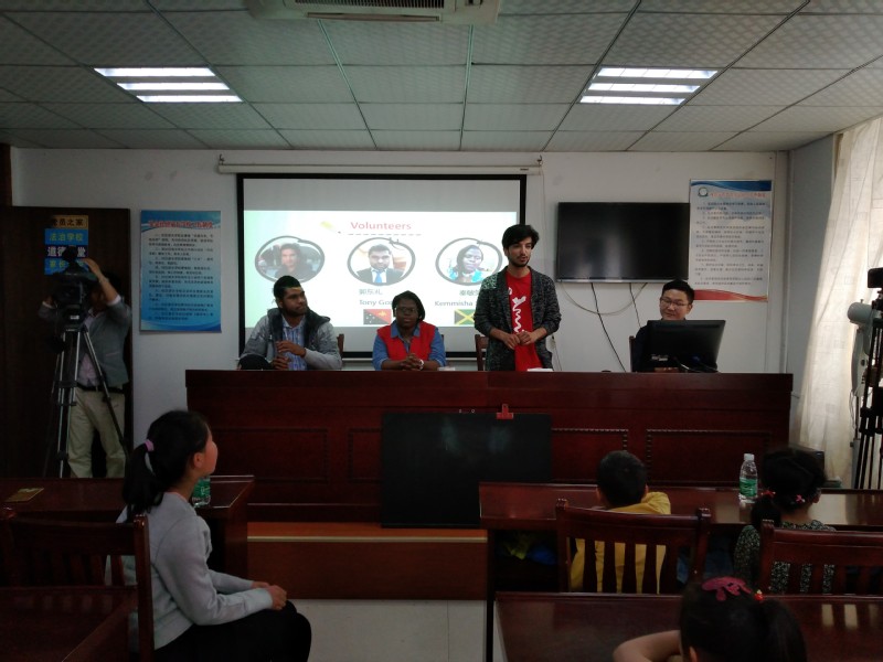 下午两点半,活动正式开始,三位留学生分别介绍了自己的家乡、专业和爱好。对与小朋友们互动有丰富经验的Adrian来说,在自我讲述中带动孩子们的参与非常容易,在他给小朋友上的第一课上,孩子们完全被他感染,全程的欢声笑语盈满教室。最后,Adrian还为孩子们献唱一首来自阿富汗的名曲,将气氛烘托到了高潮。