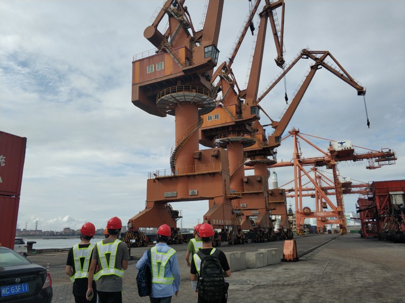 期间,实践团队来到了泉州市港口管理局,实地考察了石湖港区,在相关负责人的带领下前往码头实地学习与交流,前往码头的石料堆场、集装箱堆场、桥吊区了解装卸货物流程,还参观了在建的两个十万吨级泊位。港区作业高效有序,泊位靠泊货轮与岸壁机械都带给团队的每个成员留下了深刻的印象。