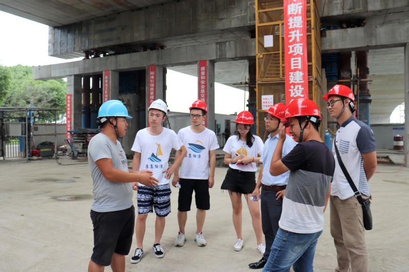 之后,实践团前往吴淞江大桥——一座矮塔斜拉桥,就其使用的桥梁顶升技术展开调研工作。团队观看了关于桥梁顶升技术的动画,并向项目部负责人进行了详细地咨询,初步了解了桥梁顶升工艺及吴淞江大桥施工现状。在进入工地进行实地学习过程中,队员们了解了液压顶升装置和绳锯,并观察记录了顶升的现场状况。