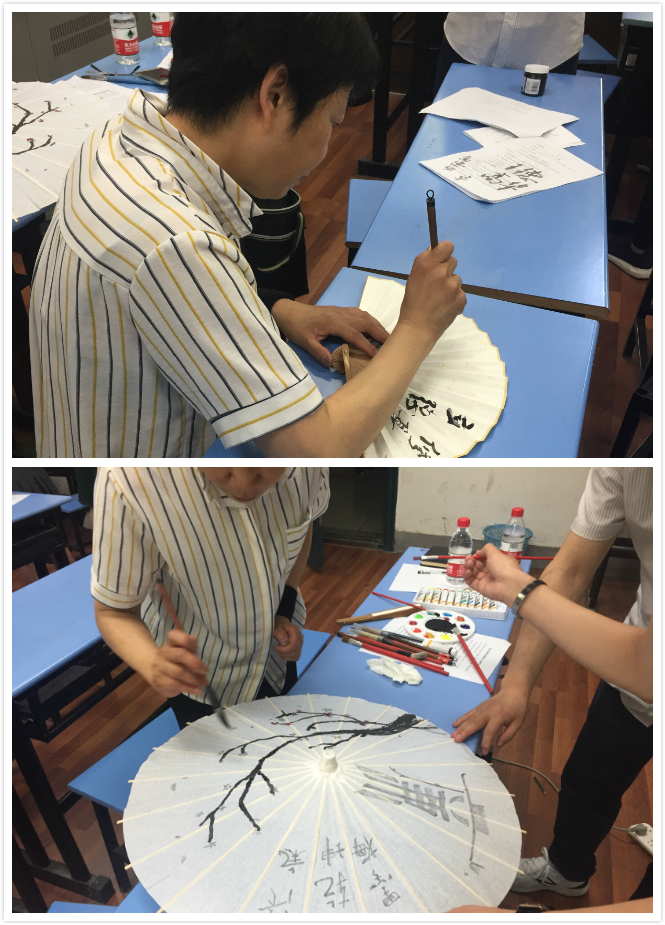 班会第二阶段,同学们分组开展了以“廉洁诚信,伴我同行”为主题的绘画活动。全班同学被分为三组,每组创作一把廉洁伞与三把诚信扇。同学们用油彩水墨在准备好的空白扇面和纸伞、纱伞上绘画出自己心中的廉洁形象。有的画竹,有的画梅,有的题字,可谓是各显神通,氛围十分热烈。活动中,高书记也亲手绘制了一幅廉洁伞,并在纸扇题上了“修身 立德 廉洁 自律”八个字,作为毕业赠礼,送给港航4班的同学们。而同学们巧妙构思,绘制了4副作品,赠送给到场的各位老师。