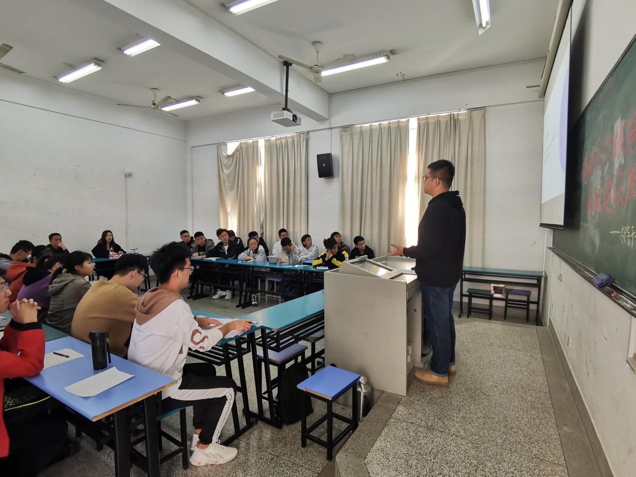 潘老师针对班级建设规划,提出了四点指导性意见:一是强化政治意识,树牢底线思维;二是注重体育锻炼,做到全面发展;三是加强心理建设,切实提高大学生心理素质;四是积极参加社会实践活动、不断发展自己,提高综合素质和能力。座谈会中,学生就思想素质提升、生涯规划指导等问题,与潘老师进行沟通交流,潘老师以自身经历,用生动形象的事例为学生答疑解惑、指明方向。