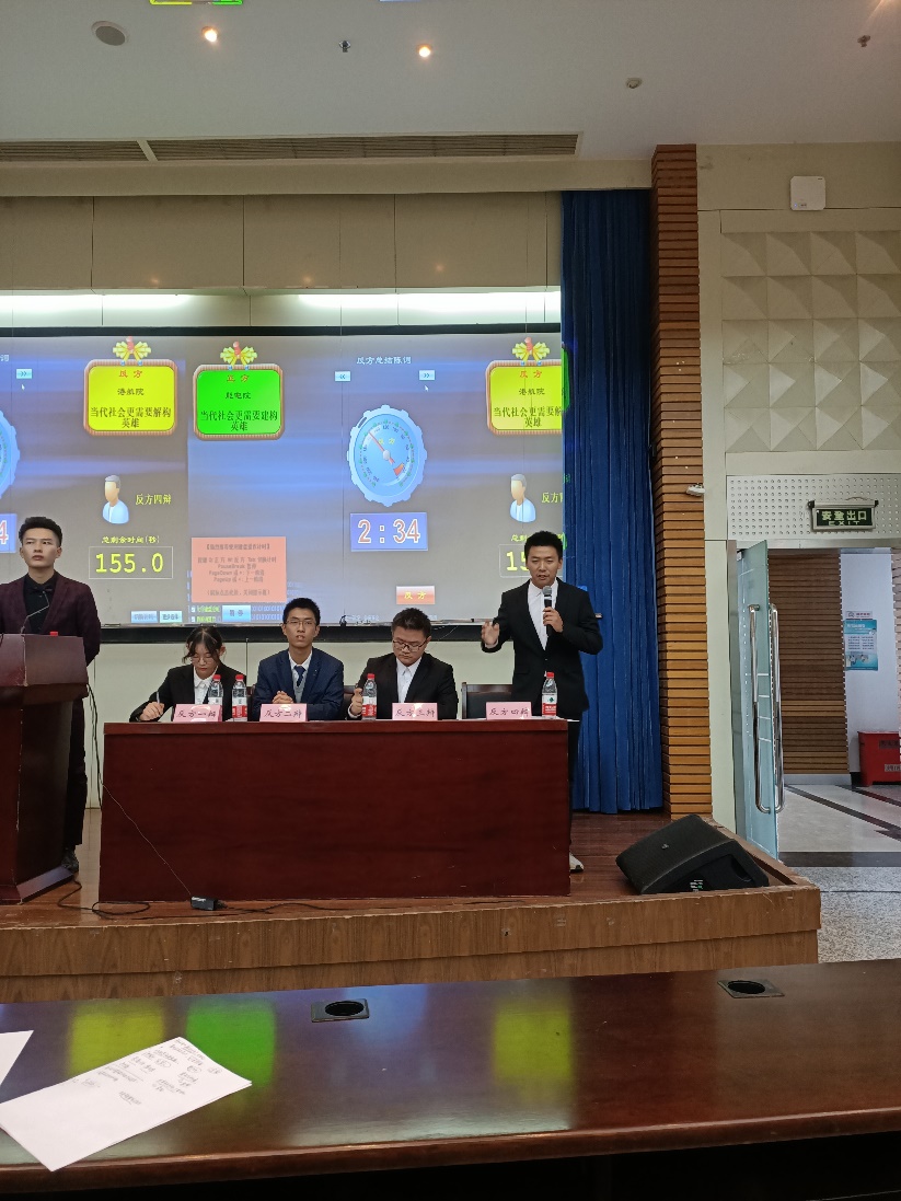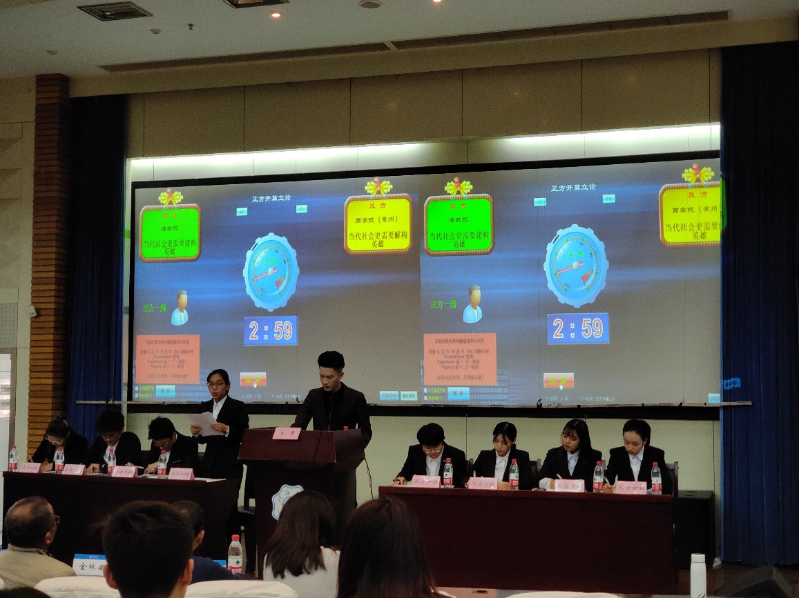 此前,港航院辩论队分别战胜计信院辩论队、马院辩论队和理学院辩论队,一路高歌冲进总决赛。在11月8日的决赛中,港航院辩论队就“当今社会更需要建构/解构英雄”辩题与能电院辩论队、商学院(常州校区)辩队以车轮战方式展开辩论。本次决赛由港航4班徐阳、袁雨葳,港航5班李卓文、邹鹏飞组成正方对阵商学院(常州校区)辩队,海资1班杨薇,港航2班张一驰,港航3班贺艺航、凌皓炜组成反方对阵能电院辩论队。