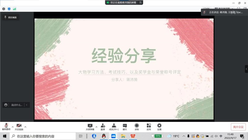 蒋佩漪同学就自己对大物的理解,从学习方法、理解方法、与高中物理、高数的联系等方面展开了经验分享。她强调,大物的学习不仅要牢记积分形式下的公式,更要对公式有自己深入的理解,这样才能在考试与日常练习中更好的应用公式。她也展示了自己的笔记,具体讲解了记笔记的方法。之后她具体讲解了评奖评优的评分细则,让同学们更加清楚的了解了评奖规则。