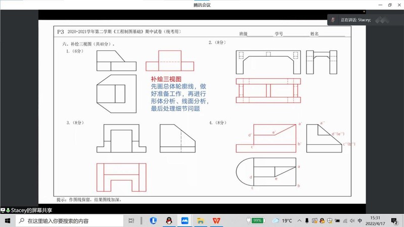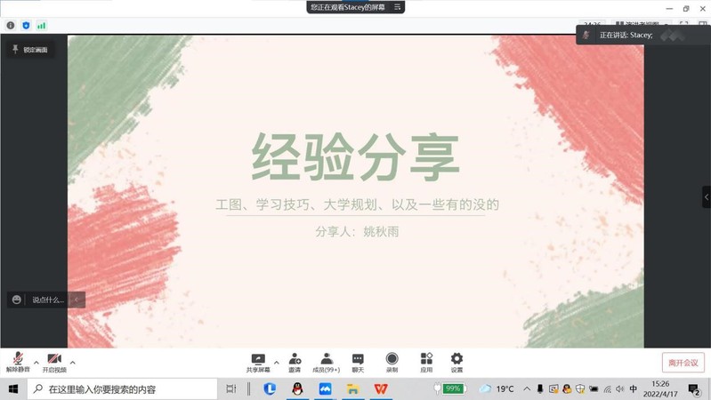 姚秋雨同学向大家具体说明了工图考试的拿分要点,以及画图过程中的注意事项。她指出工图的学习与高数线代的学习模式不同,要抓住课堂中的重点,避免因不适应学科特点而造成学习上的困难。同时她也对人生规划与当下目标的关系做了细致而很真切的分析。
