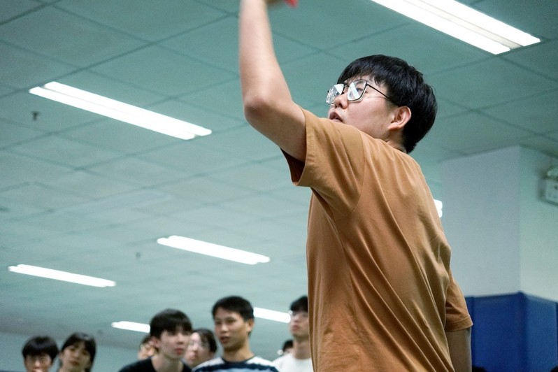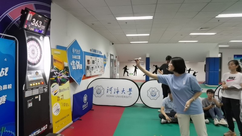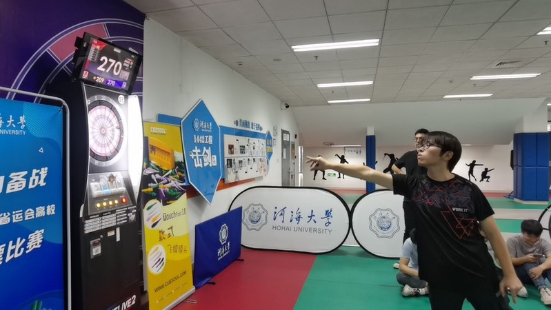 上午8时开始,学院组建的飞镖队以连续3场2:0的好成绩轻松进入八强,在八进四比赛中,以2:1战胜水电院一队,顺利进入四强,后以2:0战胜计信院一队。在冠亚军争夺战中,2018级本科生马臣广、吴昱翀分别结镖帮助团队拿下两局比赛,最终2:3惜败能电院一队,取得第二名的好成绩。