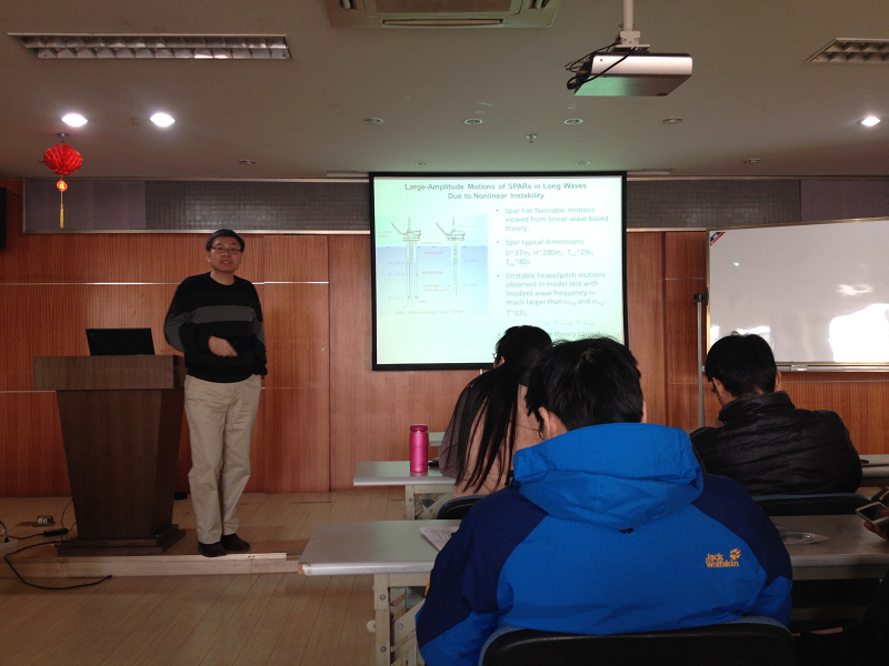 刘玉明博士结合自己在麻省理工学院二十几年的研究积累,针对海洋工程水动力学问题中的前沿成果和研究方法进行了系统的报告。重点对其负责的随机海浪场预测的研究方向进行了讲述,同时还介绍了波浪与固定及浮式海洋平台的相互作用,介绍了波浪能发电相关的系列水动力学问题,并与广大师生进行了融洽的学术探讨。