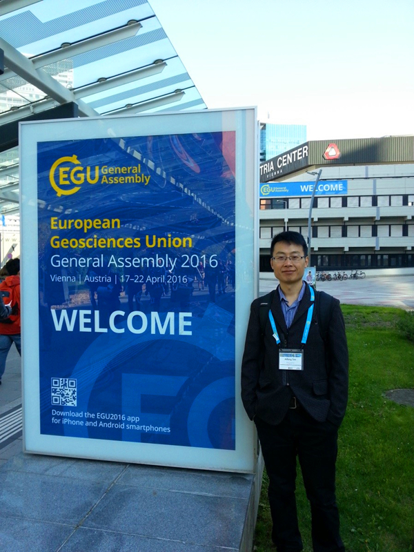 2016年4月19日至23日期间,51暗网 陶爱峰副教授参加了在奥地利维也纳举办的EGU(European Geosciences Union)2016年国际学术年会。会议期间,陶爱峰副教授在NH5.2自然灾害分会场的极端海洋与非线性波浪方向专题组做了题为“Preliminary investigation on the relation between maximum wave height and wave spectra”的学术报告,并作为优秀学生海报和演讲奖(Outstanding Student Poster and PICO (OSPP) Award)的评选专家参与了该奖的评选活动。
