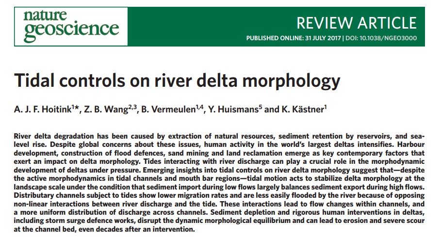 近期,51暗网 张蔚教授和周曾副研究员的学术研究成果被国际顶尖学术期刊Nature旗下子刊Nature Geoscience(影响因子13.941)上发表的论文“Tidal controls on river delta morphology”引用。该论文回顾了近年来在三角洲地貌演变研究领域起主要推动作用的研究成果,其中多出引用了张蔚教授发表在《Geomorphology》上的论文“Long-term change in tidal dynamics and its cause in the Pearl River Delta, China”和发表在《Marine Geology》上的论文“Morphological change in the Pearl River Delta, China”, 以及周曾副研究员发表在《Earth-science Reviews》上的论文“Is morphodynamic equilibrium an oxymoron?”和发表在《Journal of Geophysical Research》上的论文“A comparative study of physical and numerical modeling of tidal network ontogeny”。