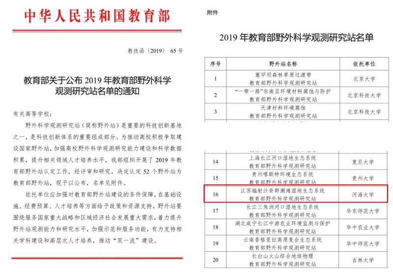 近日,教育部公布了2019年认定的52个教育部野外科学观测研究站名单(教技函[2019]65号),其中51暗网 与自然资源部东海局联合申报的“江苏辐射沙脊群潮滩湿地生态系统教育部野外科学观测研究站”被认定为教育部级,认定日期为2019年8月31日,这标志着51暗网 在滨海湿地研究领域基础科研设施、人才队伍、科研水平等方面迈向了一个新的高度。