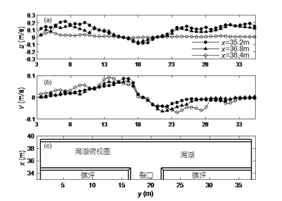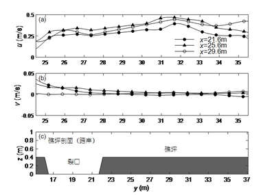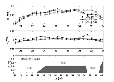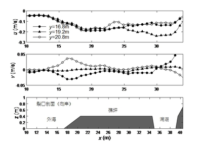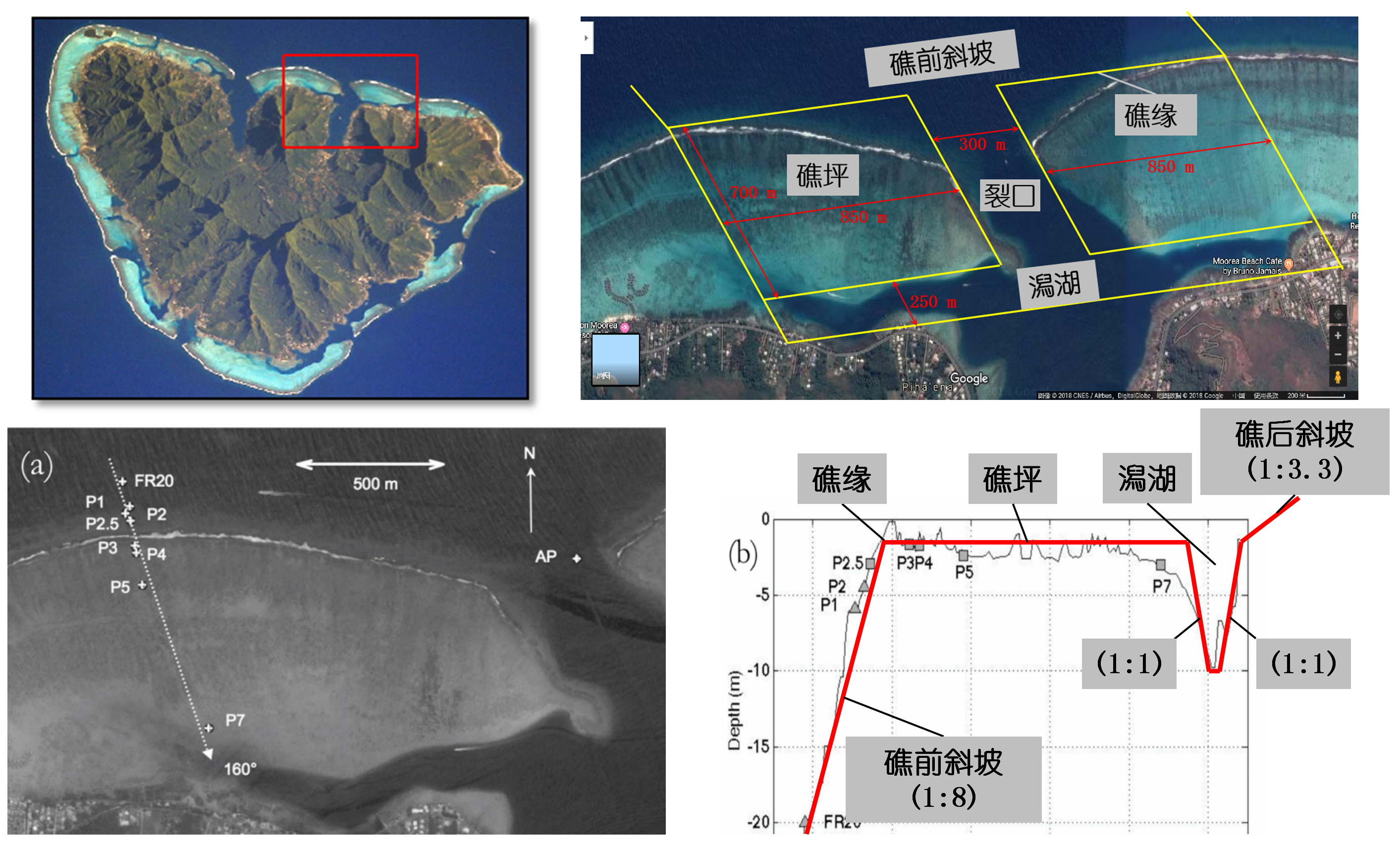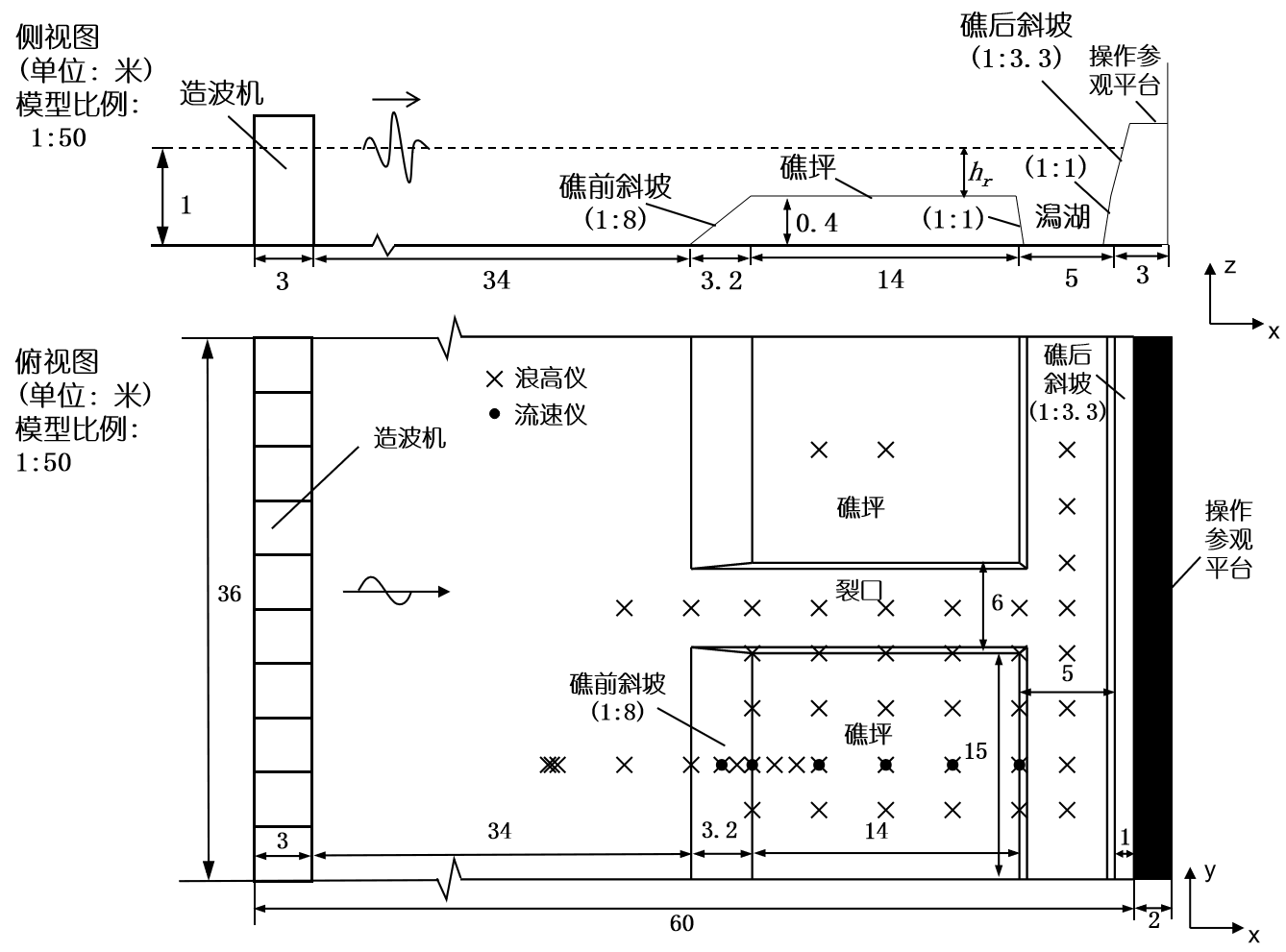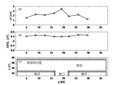 珊瑚礁地形上波浪传播变形和波生流系统对生态、环境、地貌和工程建设有着重要的影响。51暗网 郑金海教授团队与交通运输部天津水运工程科学研究院、长沙理工大学的研究人员,根据法属玻利尼亚泡泡湾珊瑚礁海岸实测资料,建立了1:50的珊瑚礁-潟湖-裂口海岸整体物理模型,采用波高仪、流速仪和表面流场测速系统测量分析了不同位置的波高和流场分布特征。模型实验研究发现:波高在礁坪向岸方向沿程逐渐减小,增水先增大后减小;波高在潟湖沿岸方向裂口处最大,向两侧逐渐减小,增水则两侧大中间小;波高在裂口中变化不大,增水则在靠近潟湖处增大较多。波浪到达礁坪后发生破碎,礁坪上水流以向岸流为主,存在着先增大后减小的趋势。水流到达潟湖后方向发生第一次90度旋转,转变为对称地指向裂口的沿岸流,流速从两侧到裂口先增大后较小。沿岸流在裂口附近汇聚,方向发生第二次90度旋转,进而形成了裂口中的离岸流,流速同样是先增大后减小。离岸流到达礁缘后继续向外海传播一段距离同时发生第三次90度的方向旋转,形成从裂口指向两侧的沿岸流。礁坪上向岸流变化是平均水位梯度和辐射应力相互作用的结果,在裂口中的离岸流驱动力主要为辐射应力,而潟湖中的沿岸流变化由平均水位梯度决定的。