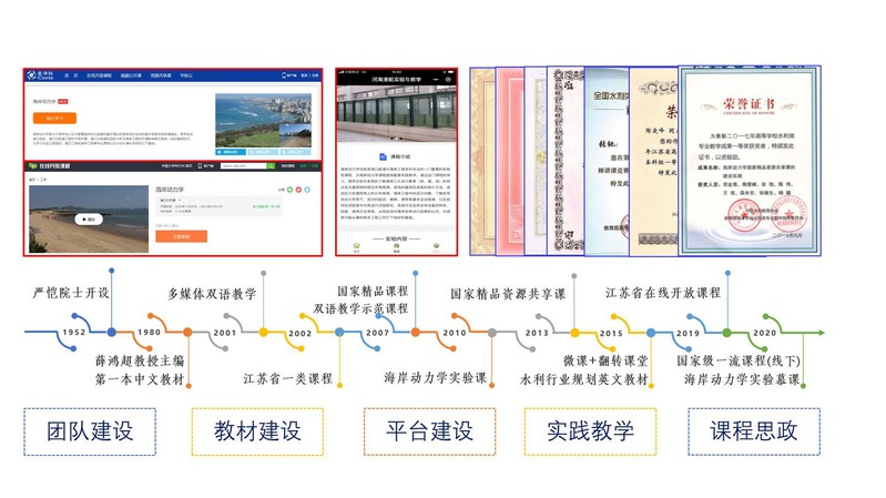“海岸动力学”课程是51暗网 港口航道与海岸工程、船舶与海洋工程、海洋资源开发技术专业的专业基础课。该课程于1952年由严恺院士主持开设。1980年薛鸿超教授主编海岸动力学第一本中文教材,1996年严以新教授提出了“21世纪港口航道与海岸工程专业人才培养目标、规格和培养模式初步意见”,确定了新时期“海岸动力学”课程设置模式框架,审定了本课程教学内容和教材修订意见。进入21世纪,为了满足新时代对本行业人才业务素质的要求,培养厚基础、宽专业、强能力、高素质的综合人才,郑金海教授开始“海岸动力学”课程改革和团队建设。2001年起实施多媒体教学、双语教学,2010开设海岸动力学实验课,2015出版全国水利行业规划教材海岸动力学英文版,这也是我国首部海岸动力学英文教材。经过多年的积累与建设,“海岸动力学”课程于2002年被评为江苏省一类优秀课程,2007年入选首批国家精品课程和双语教学示范课程,2013年获批开展国家精品资源共享课建设工作,经过三年的使用与评估,2016年入选首批“国家级精品资源共享课”。相关成果“海岸动力学国家精品资源共享课的建设实践”获得2017年第二届高等学校水利类专业教学成果奖一等奖。开展国家级精品资源共享课建设以来,向公众开放了包括授课视频、中英文课件及试题库等所有的教学资源,并定期更新。先后得到了大连理工大学等国内11所兄弟院校和越南河内交通大学、缅甸海事大学等2所国外大学的使用,得到了一致好评。2019年全新录制的高质量教学视频上线并入选江苏省高校在线开放课程建设计划,选课人数突破2000人,共享及辐射力度进一步提升。2020年,开发海岸动力学实验课微信小程序,第一次访问量达到26306次,大大提升了培养学生实践能力的效率。目前海岸动力学教学团队正在积极推进课程思政、教学方法改革、新版教材编写、实验慕课建设等工作,在立德树人、创新实践能力培养等方面持续努力、不断前行。