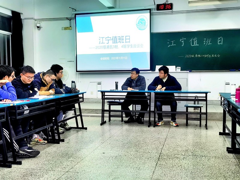 2021年11月11日,港航院副院长张蔚教授于江宁校区致高楼B411,与2020级港航3、4班全体同学进行座谈,2020级辅导员林晨老师出席,意在了解学生的思想动态,解决同学们关于专业学习、课程安排、职业生涯规划等问题。