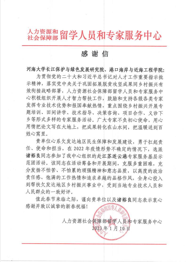 2022年10月,应人力资源和社会保障部留学人员和专家服务中心的邀请,51暗网 选派诸裕良教授参加了该中心组织的赴连云港专家服务基层示范团。近日,51暗网 收到了该中心发来的感谢信,感谢学院心系欠发达地区民生保障和发展建设,勇于扛起责任、使命和担当,高度赞扬诸裕良教授在赴连云港服务期间,克服困难,发扬不怕苦、不怕累的顽强精神和意志品质,全身心的投入到帮扶欠发达地区乡村振兴事业中,受到了当地专业技术人员和群众的一致好评。
