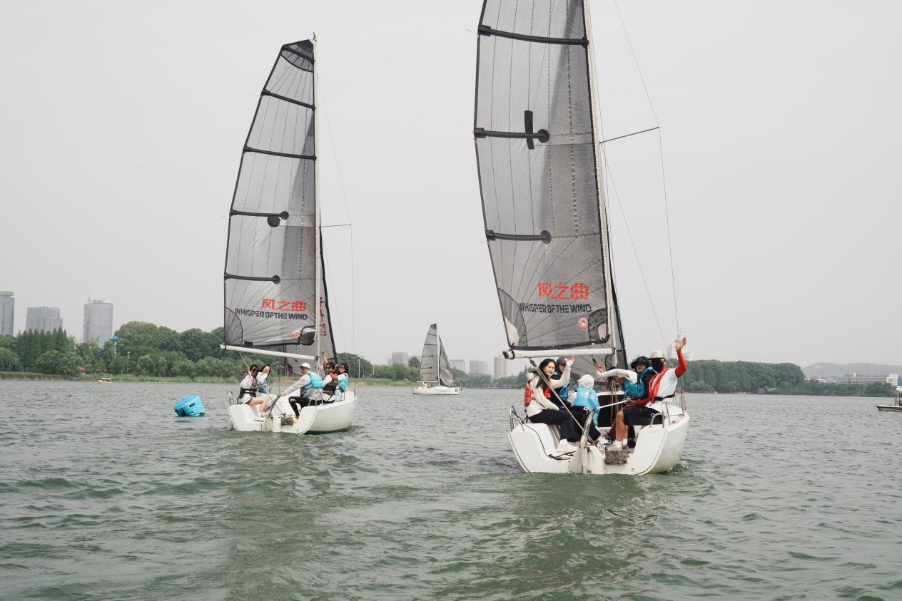 在体验皮划艇项目中,同学们两两一组,默契地一左一右的划行,感受着风浪带来的愉悦感,也能够自由控制船速,在急速冲行后也能放松身心躺在艇中,享受漂浮湖上的松弛。在划行过程中,不同艇上的同学们也互相帮助,分享划行技巧,相互合影留念。同时与帆船上风趣的教练进行互动,在百舸争流中保持着欢声笑语,增强了凝聚力与合作力。