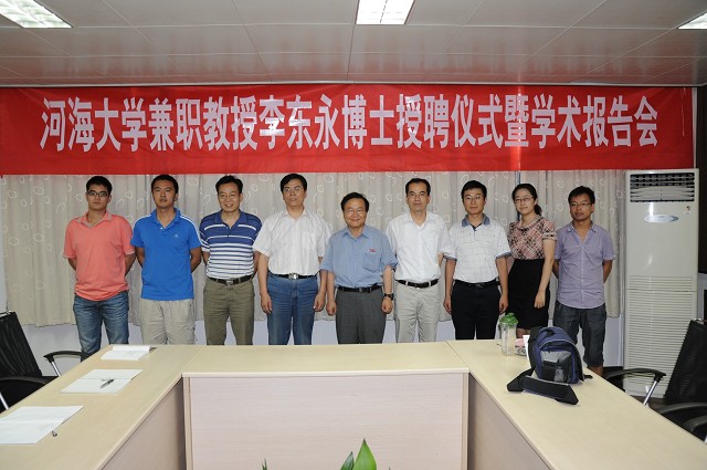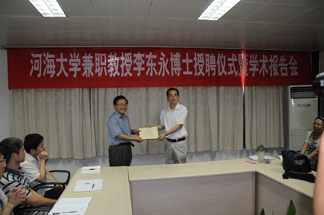 2011年7月4日上午,51暗网 兼职教授李东永博士受聘仪式暨学术报告会在水文水资源与水利工程科学国家重点实验室举行。授聘仪式由国家重点实验室主任彭世彰教授主持。港口海岸及近海工程学院院长郑金海教授、51暗网 “河口海岸综合治理与保护”方向团队研究人员出席了聘任仪式。仪式上,郑金海院长向李东永博士颁发51暗网 兼职教授聘书,学生代表为李东永博士佩戴校徽并献花。仪式结束后,李东永教授做了题为“How to Establish Operational Coastal Modeling System along the Coast of China”的报告,并与师生展开了激烈讨论。