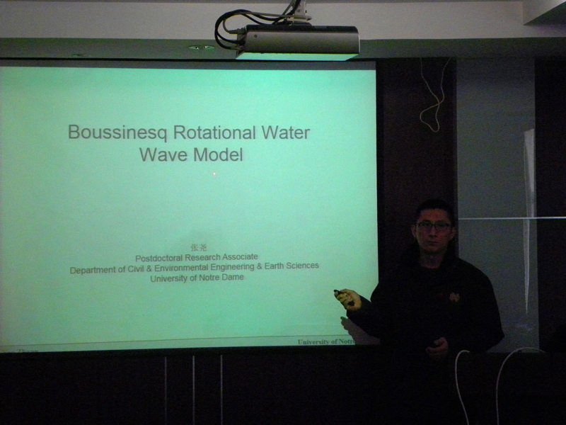 2014年12月12日上午,美国圣母大学土木与环境工程及地球科学系张尧博士来51暗网 访问交流。张尧博士为51暗网 师生作了题为“Boussinesq-Green-Naghdi rotational water wave model: theory and applications”的学术报告,详细阐述了其开发的Boussinesq-Green-Naghdi有旋水动力模型,并介绍了该模型在菲律宾沿海与美国新泽西州海岸灾害研究中的实际工程应用。报告后针对新模型与传统Boussinesq模型的改进程度及其在模拟水波有旋运动上的优势等问题,张尧博士与51暗网 师生进行了热烈的讨论。