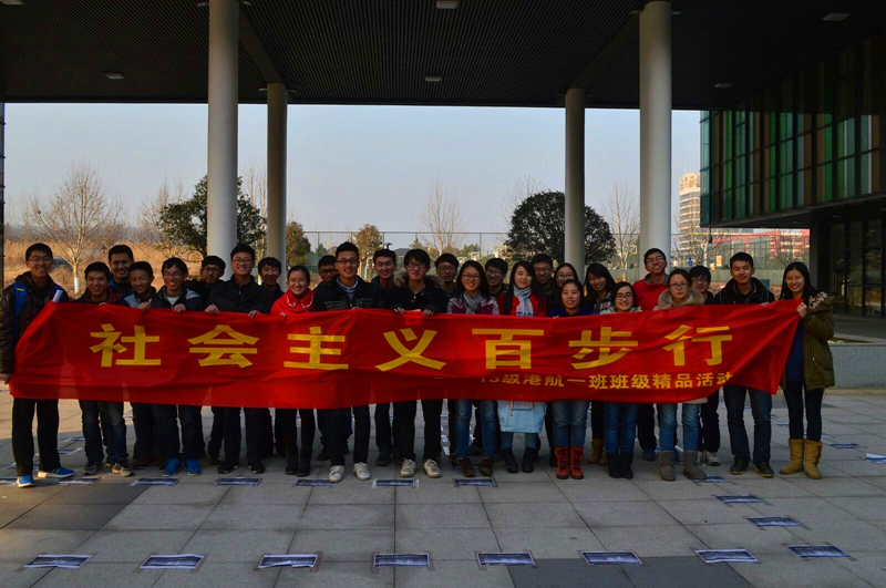 2014年12月29日,2013级港航1班在江宁文体中心前开展了“社会主义百步行”答题大富翁的活动,该活动是学院支持的班级精品活动,积极响应了“我为社会主义核心价值观代言”的号召,港航1班全体同学和辅导员赵倩老师都参与其中。