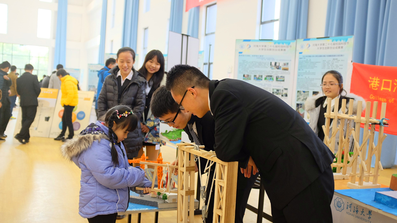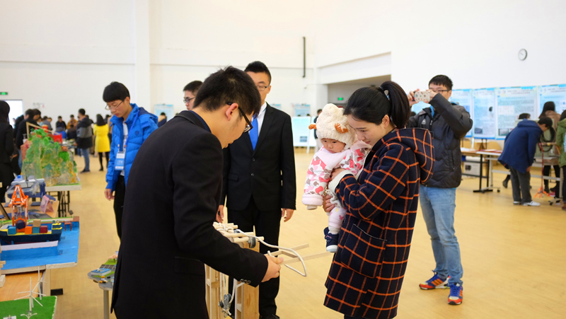 学校方面对本次科技节非常重视,许多领导专家亲临现场。学校党委郭继超副书记一行,在学院党委姜海霞副书记的陪同下,来到港航院展位,观看港航院科协的布展情况。获得“第四届全国水利创新设计大赛”特等奖的“一种GPS定位的波浪能动力船”吸引了领导们的目光。这项发明的作者从灵感来源、设计理念、原理方法和实施过程四个方面向现场人员介绍了他进行发明过程中的困难和收获,获得了在场人员的好评。学院学生院科协的工作人员也重点对学院科技节品牌活动——水工模型进行了介绍,向在场人员展示了获奖作品。郭书记一行对科技节布展作品所展现出的的大胆创新的想法和付诸实践的能力表示了赞赏,也对参加布展工作的同学们表示了感谢。下午三点,闭幕展落下帷幕,港航学子会将在科技节期间所展现的科技创新的精神和能力带到平时的学习和科研中去,努力提高自己将专业知识服务于创新的能力,争做新时代科技创新的先行者。