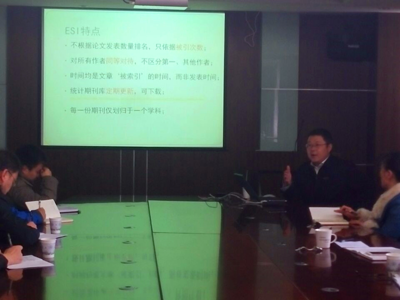 许峰教授为师生简要介绍了ESI数据库包括,着重介绍了ESI统计指标,举例深入浅出地剖析了ESI数据库的用法。图书馆多名工作人员也参加了此次报告会,并在会上展开了热烈讨论,使在场的师生对ESI数据有了更深层次的认识与理解。