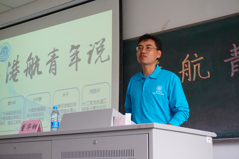 2016年10月15日上午10:30,港航院96届校友,广东省航运规划设计院有限公司总工程师、高级工程师董华钢,中国铁建港航局市场部部长、高级工程师刘宇鹏,中建筑港集团有限公司海外事业部党委书记、高级工程师朱平,长江南京航道工程局经营处处长、高级工程师顾国华返回母校,与百余名本科生相聚一堂,回忆大学生活,分享人生经验。