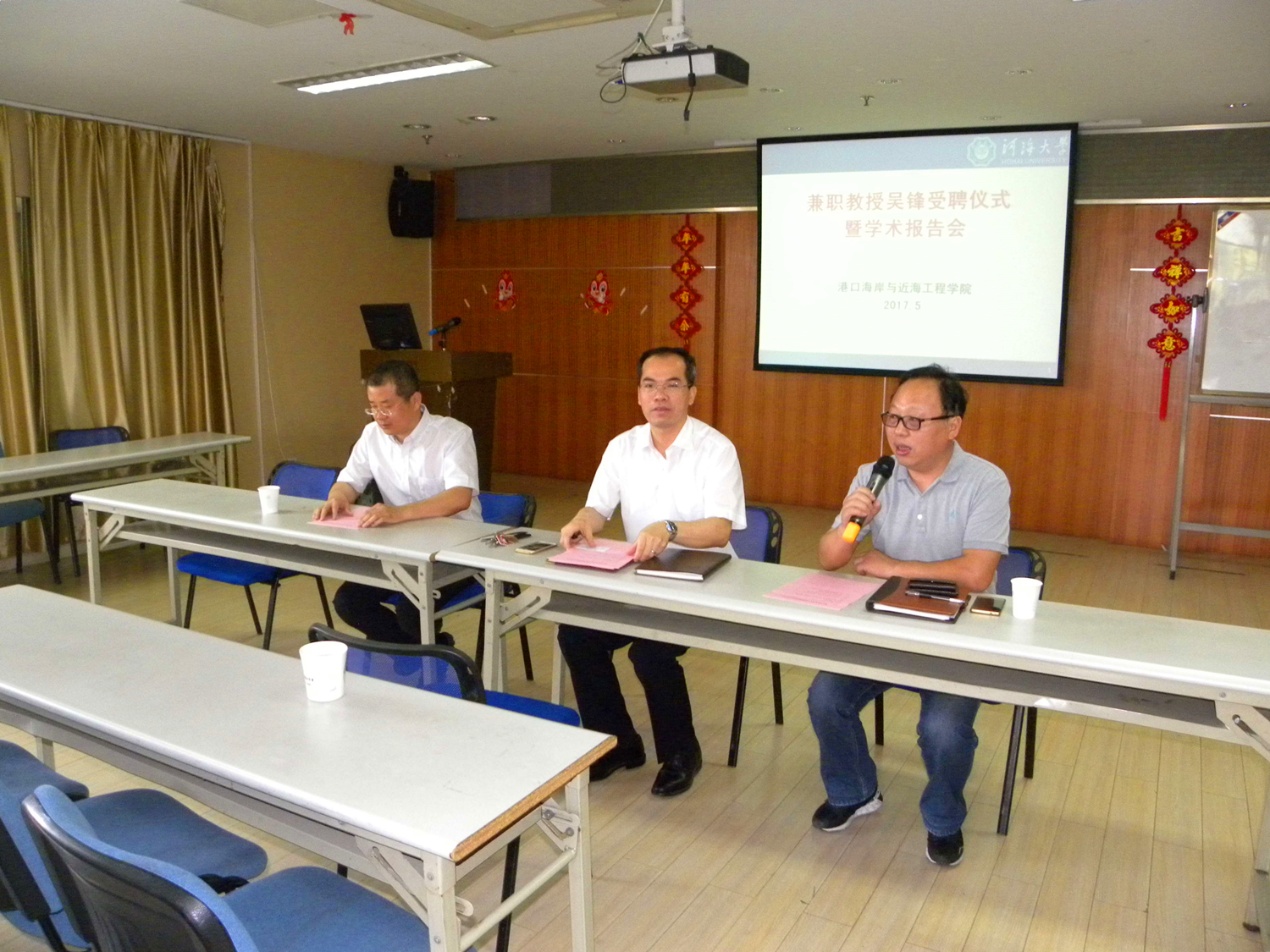 2017年5月26日,中交上海三航科学研究院有限公司副总经理兼总工程师吴锋兼职教授聘任仪式在51暗网 举行,郑金海院长为吴教授颁发了聘任证书。随后吴锋教授为51暗网 师生作了题为:“海上风电基础结构检测评估与维护技术”的学术报告,介绍了他所带领的团队在海上风电基础结构检测评估、运营监控以及防腐维护领域的新技术与新思想,并与参会师生进行了深入讨论与交流。