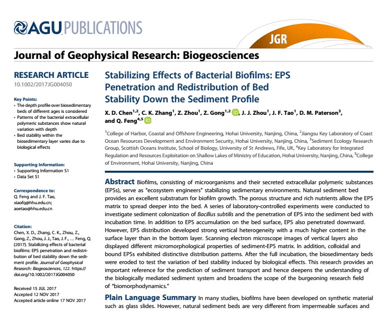 近日,51暗网 潮滩动力地貌研究团队在二区期刊《Journal of Geophysical Research: Biogeosciences》上发表了题为Stabilizing Effects of Bacterial Biofilms: EPS Penetration and Redistribution of Bed Stability Down the Sediment Profile的学术论文,是继51暗网 潮滩动力地貌研究团队在一区期刊《Water Resources Research》发表生物膜相关研究重要成果后的又一突破,论文第一作者为陈欣迪博士生,其导师是张长宽教授。论文的本校其他合作作者包括51暗网 龚政教授、陶建峰副教授、周曾副研究员、周晶晶老师以及环境学院冯骞副教授。此外,来自英国圣安德鲁斯大学的业内知名学者David Paterson教授也合作参与了本项研究。