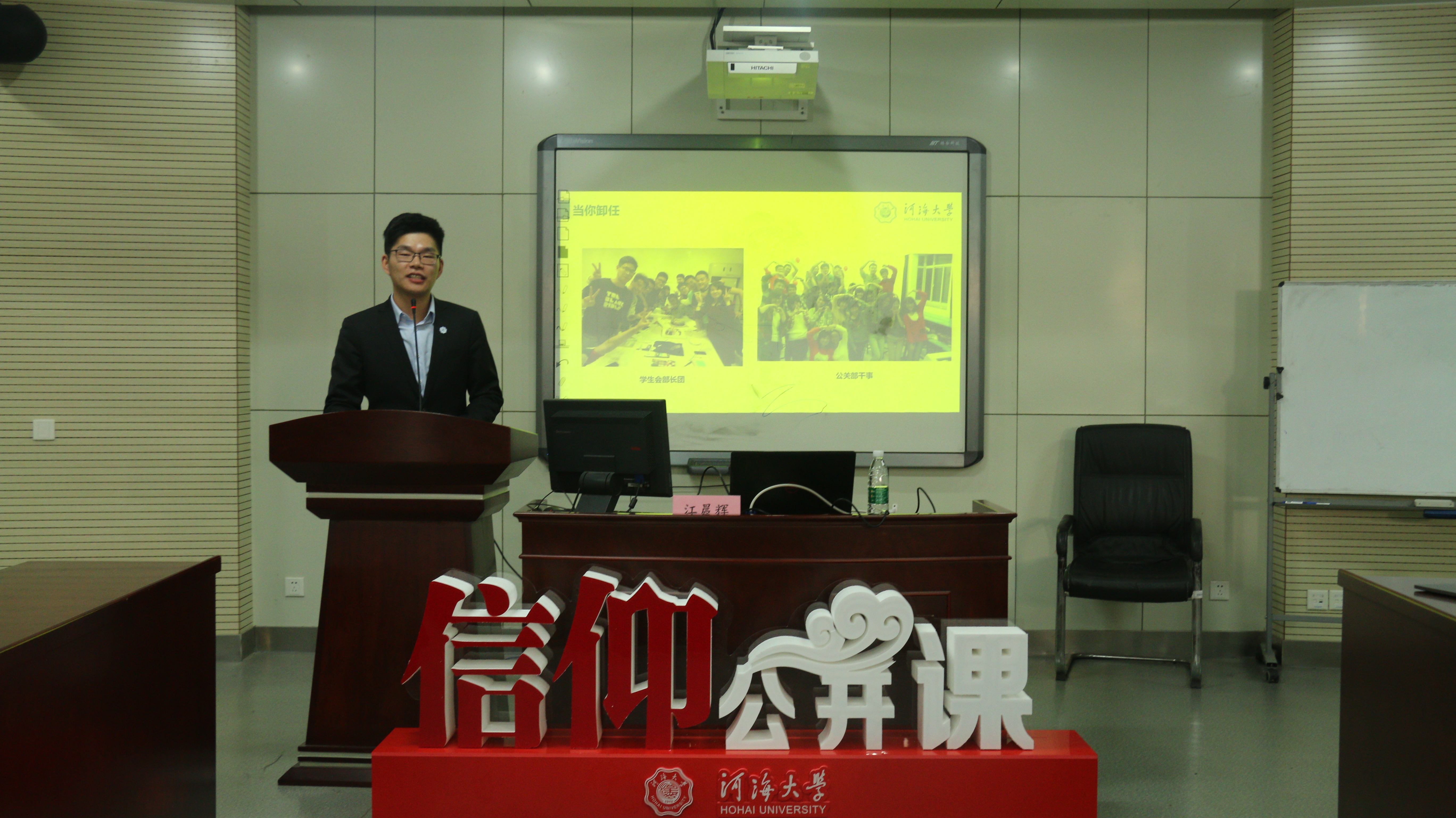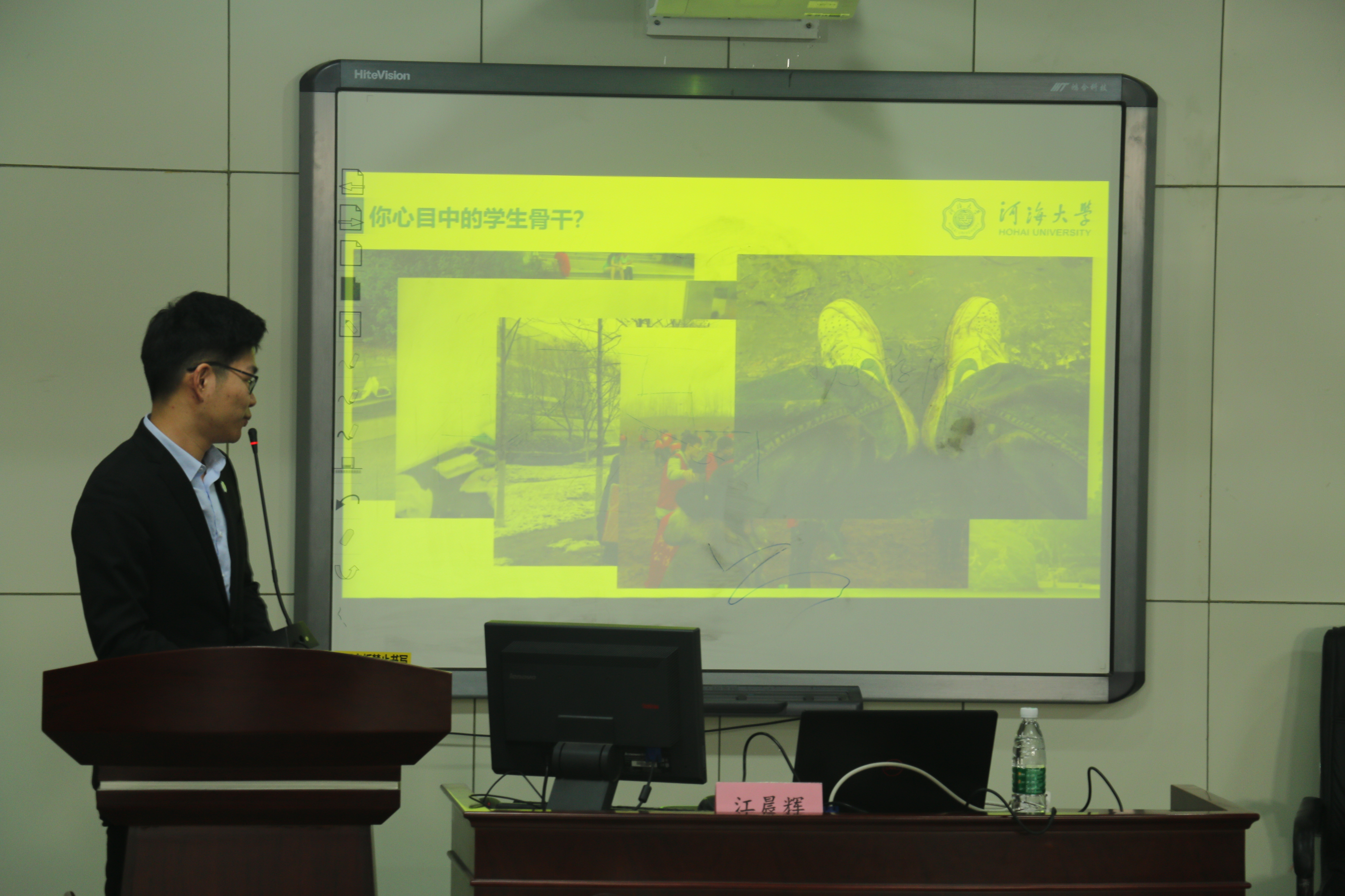 江晨辉同学以介绍其主要工作经历展开讲座,忆述了他作为干事时走过的弯道与坎坷,以期告诫同学们一个道理:凡事先汇报,随时谨记自己的角色。
