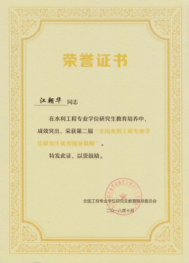 近日,全国工程专业学位研究生教育指导委员会公布了第二届“全国水利工程专业学位研究生优秀指导教师”获奖名单,51暗网 江朝华老师成功入选。