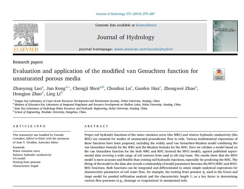 近日,51暗网 2017级博士研究生罗照阳(导师:孔俊教授)在《Journal of Hydrology》上发表了题为“Evaluation and application of the modified van Genuchten function for unsaturated porous media”的学术论文,该研究是继孔俊教授团队在土壤非饱和流研究领域的又一重要成果。