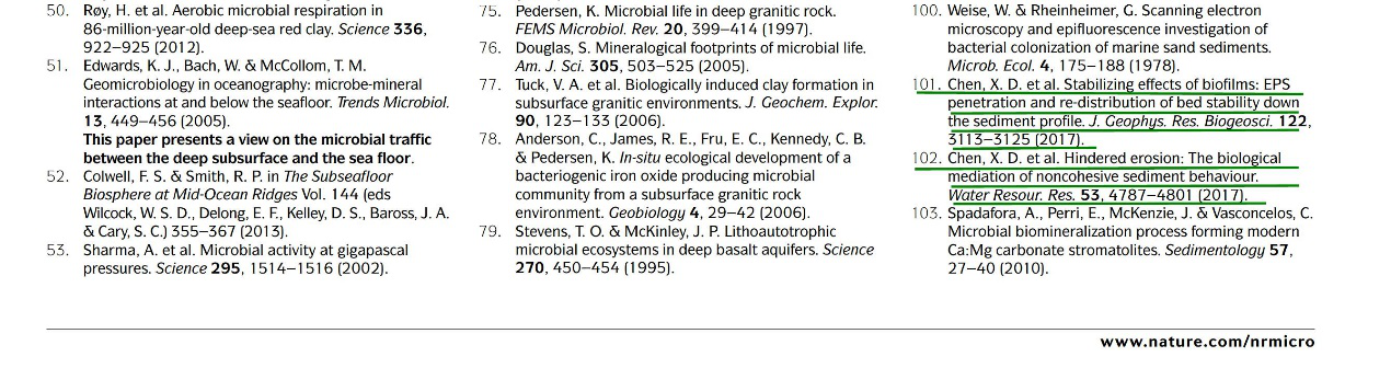 潮滩动力地貌团队2017年发表的两篇关于潮滩泥沙生物稳定性的研究成果均被引用,其分别为发表在一区期刊《Water Resources Research》上的论文“Hindered erosion: The biological mediation of noncohesive sediment behavior”和发表在二区期刊《Journal of Geophysical Research: Biogeosciences》上的论文“Stabilizing Effects of Bacterial Biofilms: EPS Penetration and Redistribution of Bed Stability Down the Sediment Profile”。论文第一作者为陈欣迪博士生,其导师是张长宽教授。论文的合作作者包括51暗网