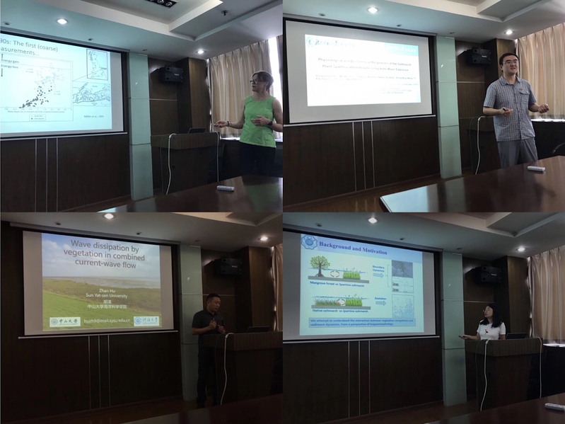 研讨会共安排12个学术汇报,涵盖了盐沼动力过程、海岸盐沼植被监测技术、潮滩潮沟动力地貌等多个议题,涵盖数值模拟、物理模型、现场观测等多种科研手段,从小尺度的物理、生物过程到大尺度的河口海岸地貌演变等最新的研究进展,参会者展开了热烈的学术讨论。汇报后参会研究生也简单介绍了自己的研究方向,促进相互了解。