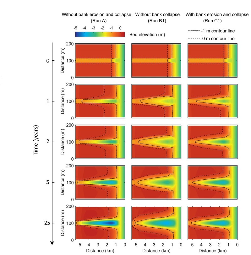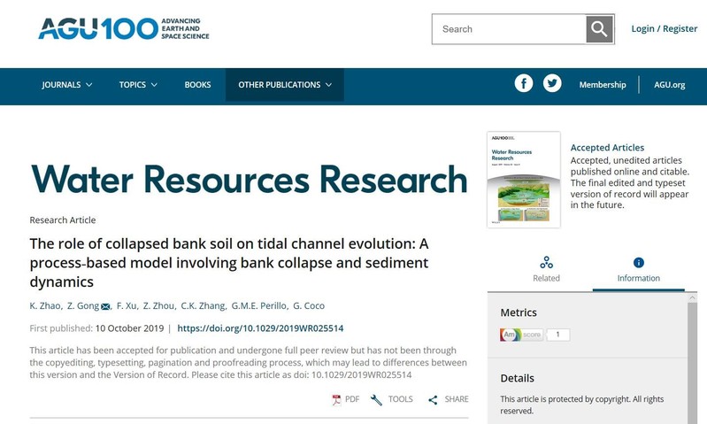 近日,51暗网 潮滩动力地貌研究团队博士生赵堃在国际权威期刊《Water Resource Research》(一区Top, 2018年影响因子4.36)上发表了题为“The role of collapsed bank soil on tidal channel evolution: A process-based model involving bank collapse and sediment dynamics”的学术论文,是继该团队在知名刊物《Geomorphology》发表岸壁坍塌对潮沟拓宽贡献研究后的又一突破。论文第一作者为51暗网 赵堃博士生,合作作者包括龚政教授、周曾教授、张长宽教授,以及华东师范大学徐凡博士、阿根廷海洋研究所G. M. E. Perillo教授和新西兰奥克兰大学Giovanni Coco副教授。