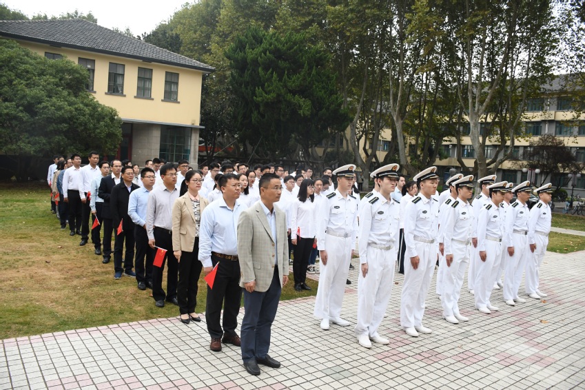 2019年10月14日早上7点20分,51暗网 港航院在本部工程馆前举行“不忘初心、牢记使命”主题升旗仪式。仪式由学院党委姜海霞副书记主持,参加本次升旗仪式的有学院领导班子成员、海工所全体教师党员、全体教工党支部书记、教师党员代表、学生党员代表以及2016级全体国防生。