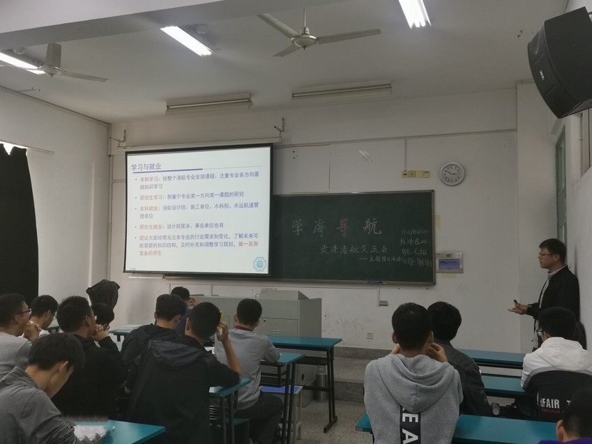 10月21日下午2点,2019级港航五班在致高楼A213教室举办“港航专业前景交流”主题班会。港航五班班导师侯利军老师及港航五班全体同学参与班会。