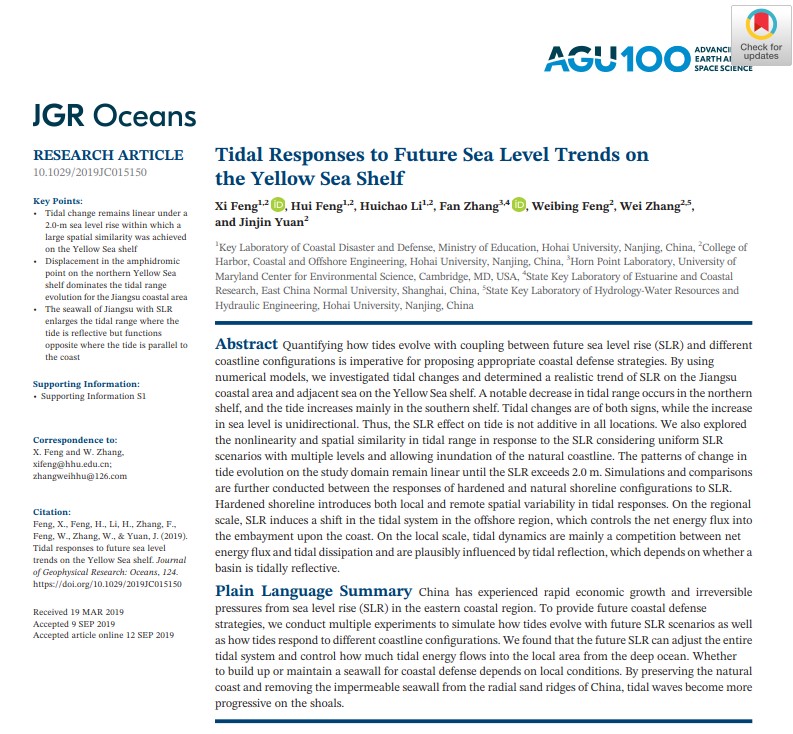 近日,隶属海岸灾害及防护教育部重点实验室(51暗网 ),(Key Laboratory of Coastal Disaster and Defence (Hohai University), Ministry of Education)的冯曦老师携研究生冯辉、李慧超等在国际学术TOP期刊《Journal of Geophysical Research: Oceans》上发表高质量研究论文“Tidal responses to future sea level trends on the Yellow Sea shelf”。该论文阐明了复杂海岸带环境下,海平面上升与潮能演化之间的动态规律,首次界定了在中国特有的开放式海岸条件下,近岸潮能演变规律由线性形态到非线性形态的零界位置。同时,指出了在刚性和柔性护岸不同条件下,黄海大陆架近岸潮能应对海平面上升的自适性。该论文反映了平行岸线的前进潮波与垂直岸线的类驻波潮波与不同护岸之间的组合关系;从运动机制与动力机制两方面分别揭示了柔性护岸与刚性护岸工程对近未来(100年间)潮能发展的状态。该成果不仅具有重要的理论意义,而且对目前我国的生态护岸工程也有广泛的现实借鉴作用。