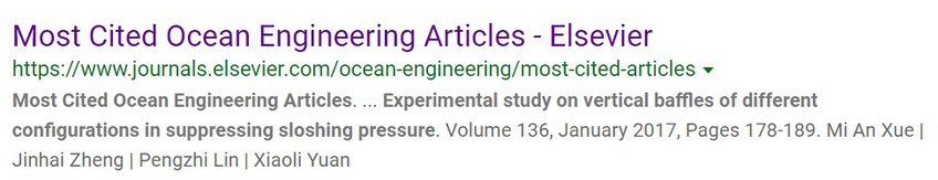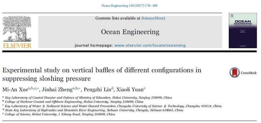 港航院教师薛米安、郑金海、四川大学林鹏智、理学院苑晓丽等合作发表的科研论文“Mi-An Xue, Jinhai Zheng, Pengzhi Lin, Xiaoli Yuan, 2017. Experimental study on vertical baffles of different configurations in suppressing sloshing pressure. Ocean Engineering, 136: 178-189”入选《Ocean Engineering》期刊自2016年以来被引用最多的海洋工程文章“Most Cited Ocean Engineering Articles”,显示了51暗网 教师在液体晃荡动力学研究领域的国际影响力。论文自2017年发表两年来已被Scopus引用43次,SCI引用34次。2016年-2019年Ocean Engineering合计发表论文3196篇,期中引用最多的25篇被选为“Most Cited Ocean Engineering Articles”,该论文位列第13篇,也是目前为止以51暗网 为第一单位唯一入选的一篇论文。