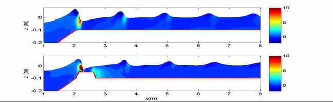 | 新型高效非静压水动力数值模式 基于欧拉方程采用Taylor级数展开提出了水平方向最高导数为二阶的新型非静压波浪数值模式,空间三层即可适用kd≤10π 的极深水范围。提出了非静压模型网格分离求解方法(PDI),泊松方程的计算时间可减少80%以上。该方法已被美国特拉华大学开发的NHWAVE模型和荷兰代尔夫特理工大学开发的SWASH模型所采用。