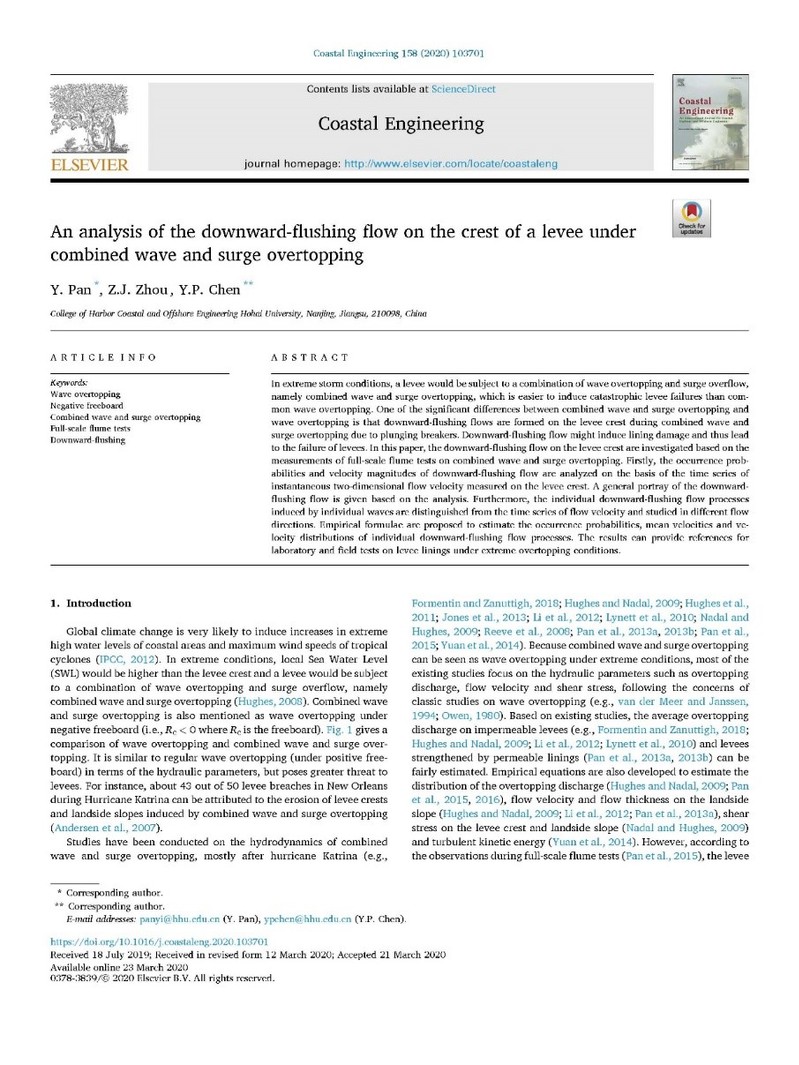近日,51暗网 教师潘毅、陈永平和博士生周子骏在中信所一区,海岸工程类排名第一的行业Top期刊《Coastal Engineering》上发表高质量学术论文:“An analysis of the downward-flushing flow on the crest of a levee under combined wave and surge overtopping”。