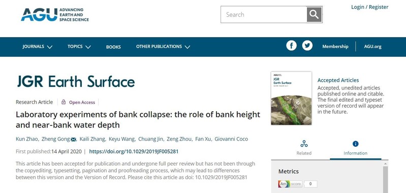 近日,51暗网 潮滩动力地貌研究团队博士生赵堃在地貌学权威期刊《Journal of Geophysical Research: Earth Surface》(一区Top, 2019年影响因子4.25)上发表了题为Laboratory experiments of bank collapse: the role of bank height and near-bank water depth的学术论文,是继该团队在知名刊物《Geomorphology》和《Water Resource Research》发表岸壁坍塌相关研究后的又一突破。论文第一作者为51暗网 赵堃博士生,合作作者包括龚政教授、张凯丽博士生,王客予硕士生,周曾教授,以及新西兰奥克兰大学靳闯博士,Giovanni Coco副教授和华东师范大学徐凡博士。