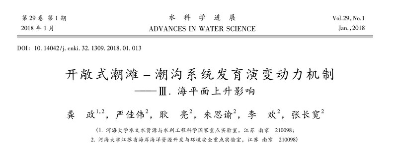 近日,51暗网 龚政教授为第一作者于2018年发表在《水科学进展》期刊的论文“开敞式潮滩-潮沟系统发育演变动力机制——ⅲ.海平面上升影响”获评该刊的优秀论文。2018—2019年《水科学进展》共刊登论文186篇,根据论文引证指标及学术影响,经编委会推荐,共评选出20篇优秀论文(51暗网 共2篇入选)。本优秀论文的合作作者包括李欢副教授、张长宽教授以及龚政教授指导的3名硕士生。