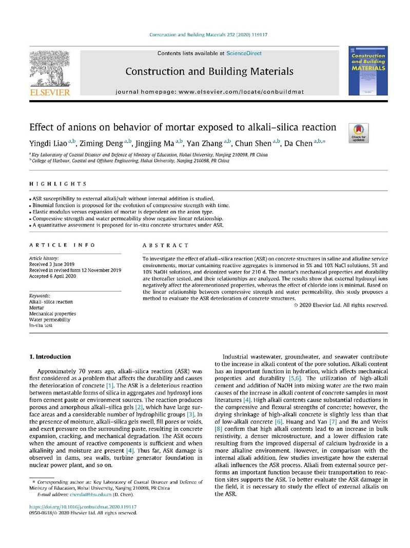 近日,工程技术学科一区TOP期刊《Construction and Building Materials》(影响因子4.046)在线发表51暗网 廖迎娣副教授完成的研究成果“Effect of anions on behavior of mortar exposed to alkali–silica reaction”。