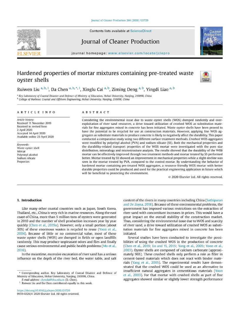 近日,51暗网 陈达教授指导的博士研究生刘睿文在ESI工程学国际排名Top30的权威期刊《Journal of Cleaner Production》(一区Top,影响因子6.395)上发表了题为“Hardened properties of mortar mixtures containing pre-treated waste oyster shells”的学术论文。