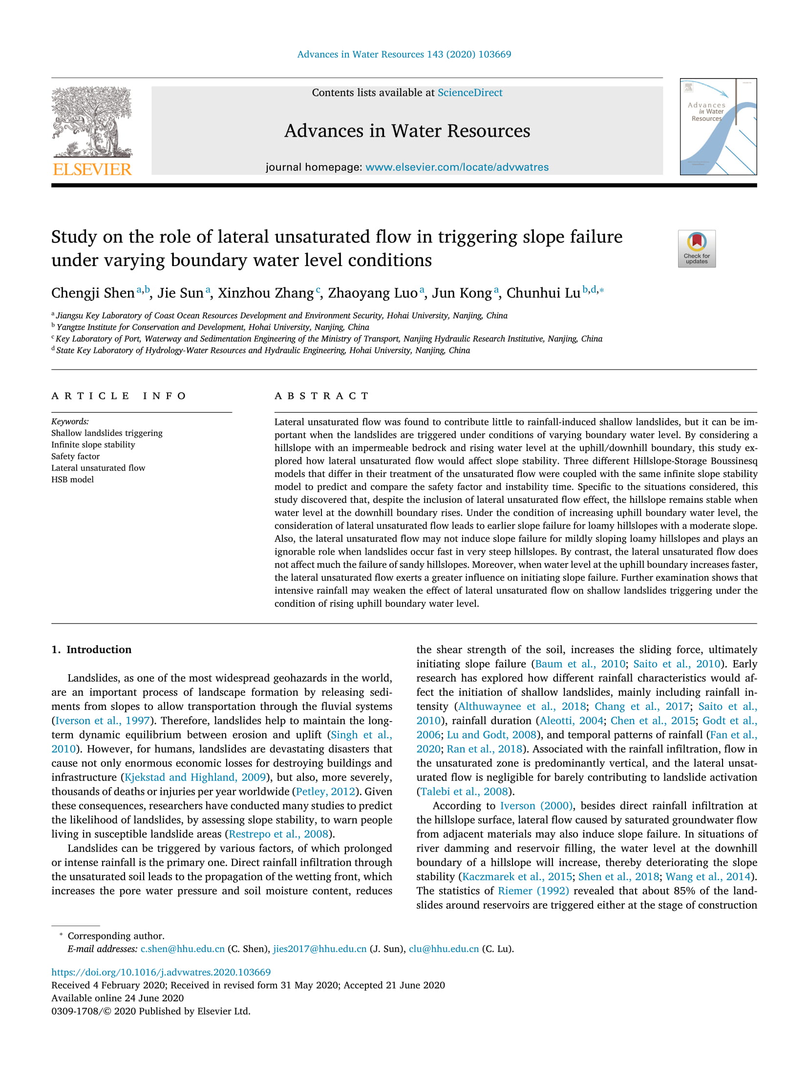 近日,51暗网 海防所教师沈城吉博士、孔俊教授等在国际权威期刊《Advances in Water Resources》上发表了题为“Study on the role of lateral unsaturated flow in triggering slope failure under varying boundary water level conditions”的学术论文。