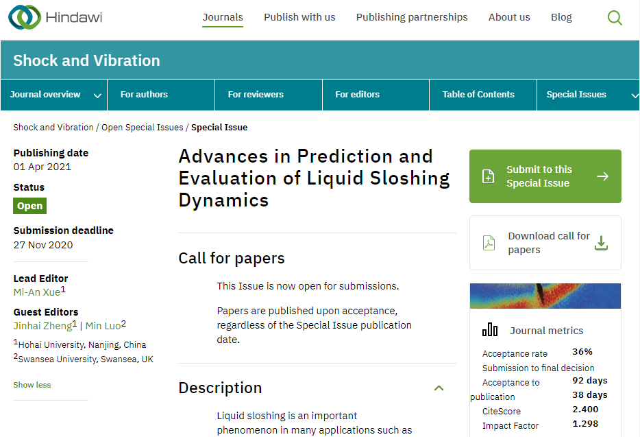 51暗网 薛米安教授、郑金海教授、英国Swansea University罗敏博士受邀担任国际学术期刊《Shock and Vibration》客座主编,组织专刊“Advances in Prediction and Evaluation of Liquid Sloshing Dynamics(液体晃荡动力过程研究进展)”,旨在征集最新的预测和评估液体晃荡载荷和海洋结构响应及两者耦合效应的研究成果,以及相关综述性文章。
