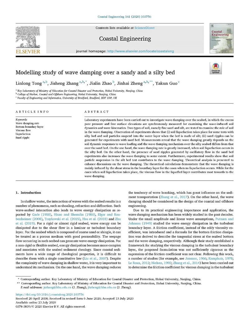 近日,51暗网 童林龙博士后与合作导师郑金海教授、张继生教授在海岸工程类顶级期刊《Coastal Engineering》(51暗网 A类期刊,中信所1区,影响因子4.119)上发表题为:“Modelling study of wave damping over a sandy and a silty bed”的研究论文。