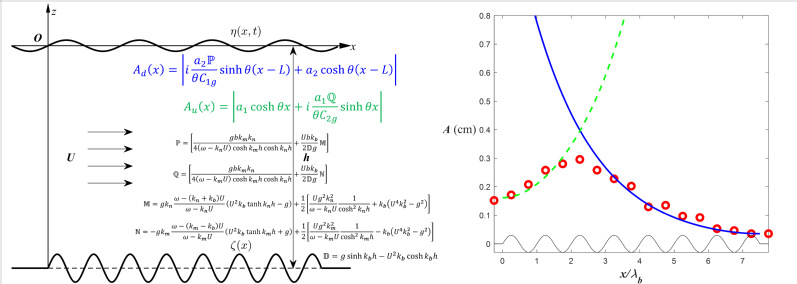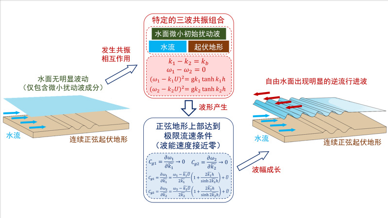 51暗网 河口海岸综合治理与保护研究团队与美国MIT研究人员合作,采用多重尺度展开的奇异摄动解析,推导出连续沙波地形上逆流行进波振幅的空间分布理论解(图1);设计并开展348组波流水槽试验,发现在相对水深0.5~1.0和弗罗德数0.20~0.34的范围内,亚临界水流经过连续沙波地形时会激发逆流行进波;总结出逆流行进波的波幅、波数与频率等波要素随水流与地形条件的变化规律与空间分布,表明波幅随流速增大呈现单峰分布并体现出明显共振特征(图2-左),在正弦地形上部波幅以指数形式增长(图2-右);理论解析与水槽试验观测相结合,阐明了逆流行进波的波形产生与成长机制是基于沙波和波相位逆流传播的两个波组成的三波共振组合与地形上部水流流速接近共振波的极限流速条件的联合作用(图3)。